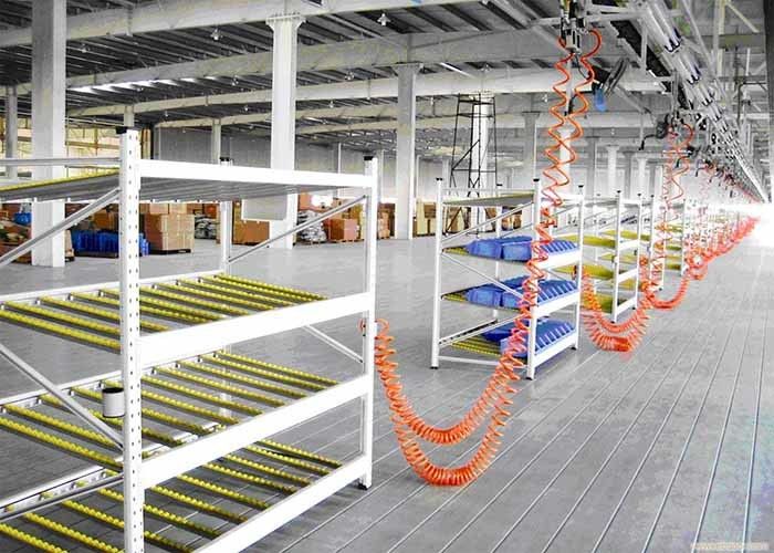 Dalam hal rak aliran palet gravitasi, palet ditempatkan pada rol yang miring ke arah muka pick oleh gravitasi didorong, "pertama masuk dan pertama keluar".dan diambil dari sisi berlawanan menghilangkan penanganan ganda dari area penerimaKecepatan throughput dikombinasikan dengan rotasi stok otomatis adalah keuntungan utama dari sistem ini.